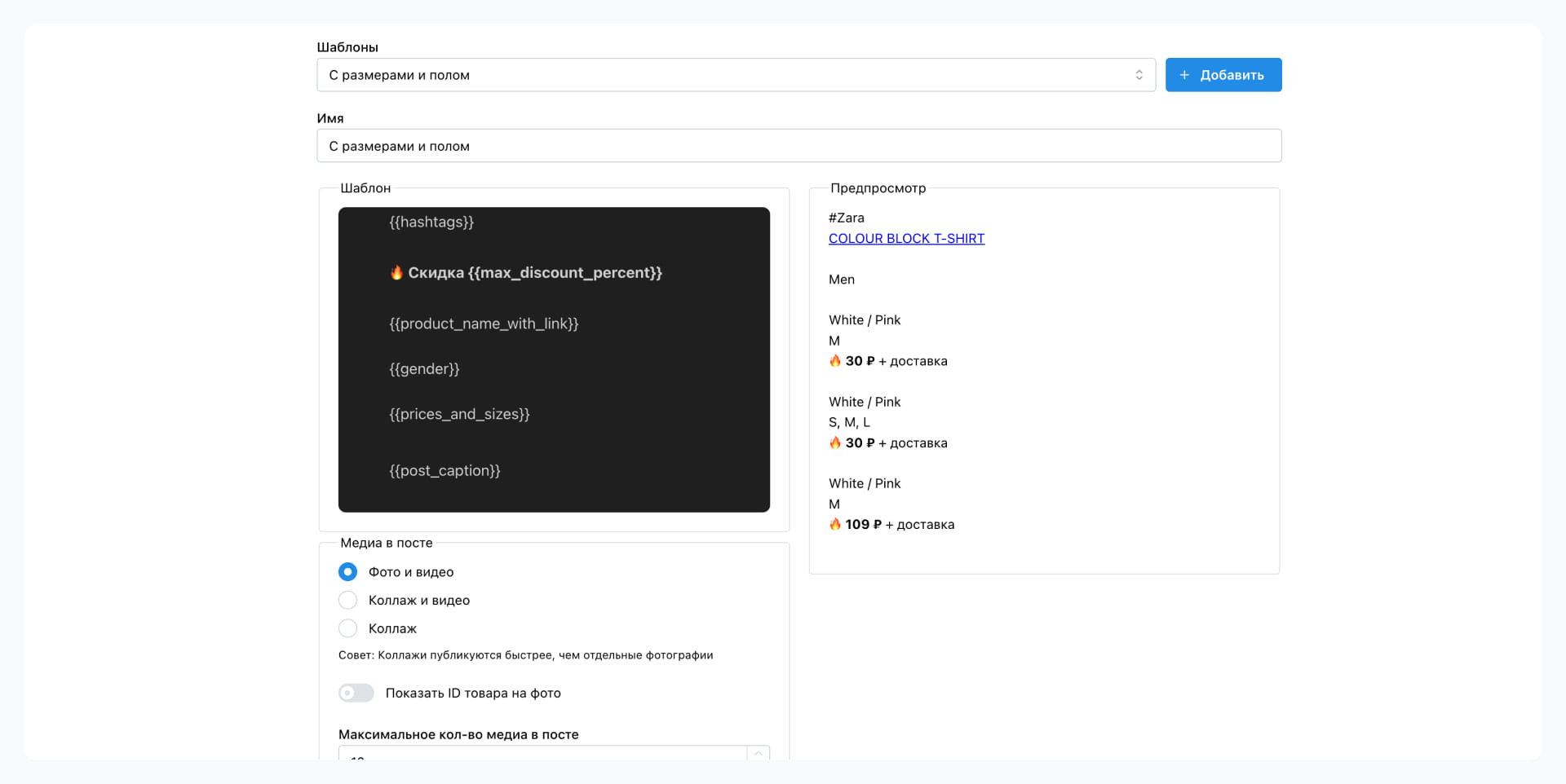 Настройте шаблон под свой стиль и публикуйте посты в один клик. Ссылки, цены, скидки, размеры и медиа подтягиваются автоматически.